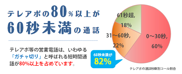 1分以内の通話が80%も占めているのに「3分8円」とういう料金では、 80%以上の電話で2分以上も無駄な料金を支払っていることになります。『秒間電話PRO』は、テレアポや営業電話に最適な使った分だけの「1秒課金」! 営業お断り、留守番電話等の契約に繋がらない通話に無駄な通信費をかけることが無くなります。